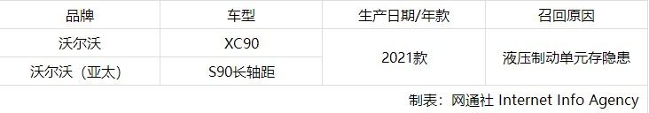 日前,网通社从国家质检总局获悉,部分2021款XC90、2021款国产S90长轴距由于液压制动单元助力泵的电机中连接电机转子轴与磁体之间焊点可能部分或完全缺失,极端情况下可能造成车辆减速性能低于正常情况,并导致ABS、ESC等功能受限,存在安全隐患。 汽车销售(上海)有限公司、大庆沃尔沃汽车制造有限公司决定自10月22日起召回4辆2021款XC90,以及12辆2021款国产 S90长轴距车型。