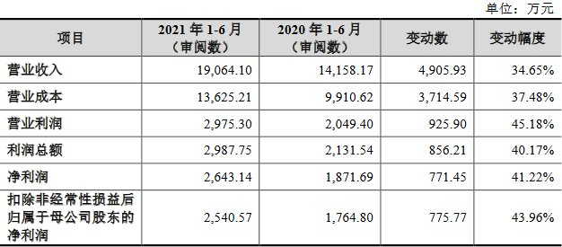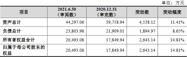 根据招股说明书,中审众环会计师事务所(特殊普通合伙)对邵阳液压截至2021年6月30日的财务状况和2021年1月-6月的经营成果及现金流量情况进行了审阅,并出具了“众环阅字(2021)号”《审阅报告》。截至2021年6月30日,邵阳液压总资产为4.43亿元,较2020年末增长11.41%;负债总额为2.38亿元,较2020年末增长8.65%;公司的资产总额和负债总额与上年末相比有所增加。2021年1-6月实现营业收入1.91亿元,较上年同期增长34.65%;2021年1-6月实现净利润2643.14万元,较上年同期增长41.22%;2021年1-6月实现扣除非经常性损益后归属于母公司股东的净利润2540.57万元,较上年同期增长43.96%。?