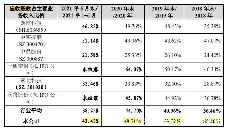 2018年末-2021年6月末,唯万密封应收账款余额分别为1.34亿元、1.43亿元、2亿元和2.03亿元,报告期内,公司给予部分经营规模较大、资信状况良好的下游客户30天-120天不等的信用期,其中,公司前五名客户(同一实际控制人合并口径)应收账款余额分别为7,427.26万元、7,976.10万元、1.11亿元和1.04亿元,占同期末应收账款余额总额的比例分别为55.46%、55.71%、55.39%和51.10%。报告期各期末公司应收账款余额占主营业务收入比例分别为55.26%、49.72%、49.71%和42.43%,公司应收账款余额占主营业务收入比例总体高于同行业平均水平36.46%、40.96%、44.7%和38.25%。