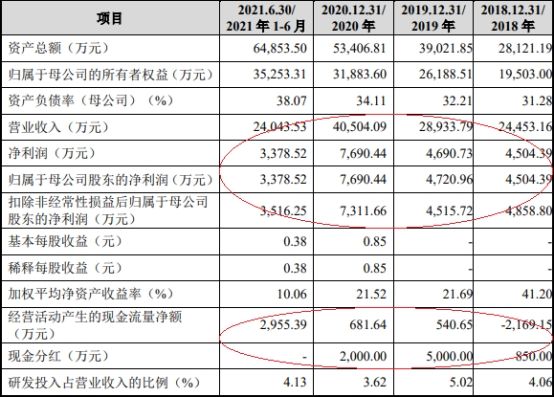 2017年至2021年1-6月,唯万密封营业收入分别为1.05亿元、2.45亿元、2.89亿元、4.05亿元、2.40亿元,归属于母公司股东的净利润分别为2034.41万元、4504.39万元、4720.96万元、7690.44万元、3378.52万元,扣除非经常性损益后归属于母公司股东的净利润分别为1894.87万元、4858.80万元、4515.72万元、7311.66万元、3516.25万元,经营活动产生的现金流量净额分别为-608.14万元、-2169.15万元、540.65万元、681.64万元、2955.39万元。?