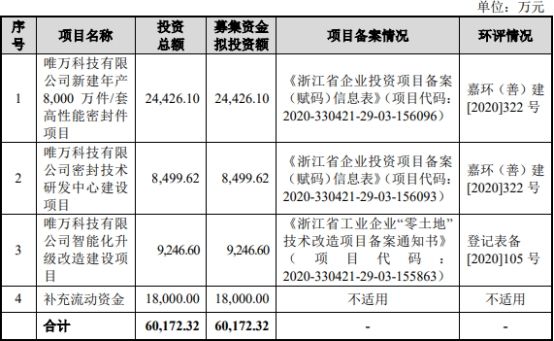 唯万密封此次拟募集资金6.02亿元,其中,2.44亿元用于唯万科技有限公司新建年产8000万件/套高性能密封件项目,8499.62万元用于唯万科技有限公司密封技术研发中心建设项目,9246.60万元用于唯万科技有限公司智能化升级改造建设项目,1.80亿元用于补充流动资金。?