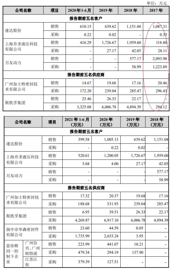 唯万密封2019年至2021年1-6月向前五名供应商之一扬中市华森密封件有限公司销售金额分别为0.05万元、44.59万元、23.60万元,同期向该公司采购金额分别为3.95万元、2653.24万元、1735.99万元。?