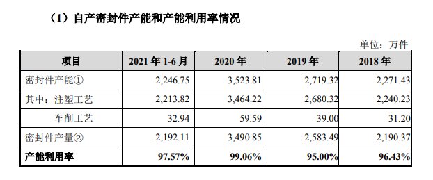 招股书显示,2020年,唯万密封密封件产能已经达到3523万件。然而公司所在地嘉兴市生态环境局嘉善分局2020年11月受理的《关于受理唯万科技有限公司新建年产8000万件/套高性能密封件项目环评文件的公告》显示,唯万科技有限公司已审批产能为年产?2000?万件/套高性能密封件。